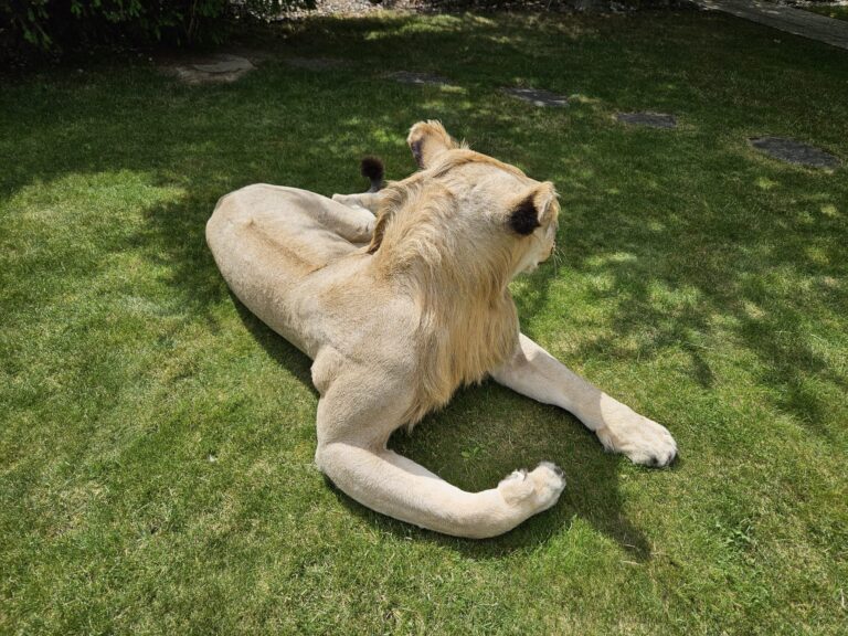Sourced from a private taxidermy collection in Slovakia, the mount has been meticulously preserved and remains in excellent condition. Measuring an impressive 106 inches in total length (including tail) and approximately 21 inches wide at its broadest point, this lion is both a powerful display and a conversation-worthy centerpiece for collectors, museums, or themed interiors.