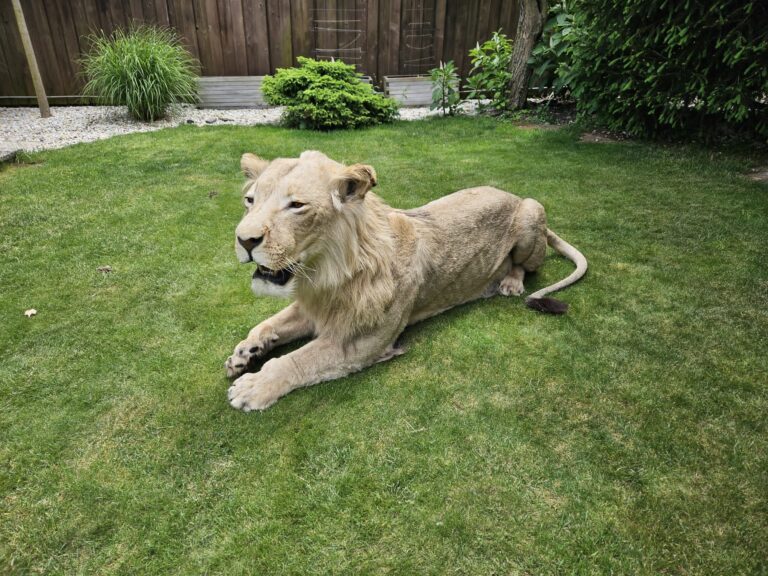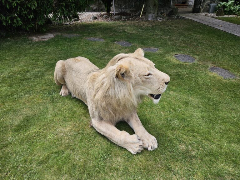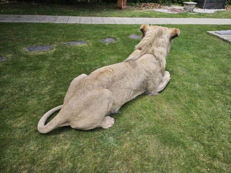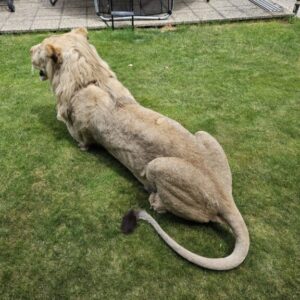 Sourced from a private taxidermy collection in Slovakia, the mount has been meticulously preserved and remains in excellent condition. Measuring an impressive 98 inches in total length (including tail) and approximately 20 inches wide at its broadest point, this lion is both a powerful display and a conversation-worthy centerpiece for collectors, museums, or themed interiors.