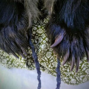 On each side, wolf bones and two black bear claws are securely held by jet-black moose leather cords, which serve as an adjustable fitting system, ensuring a perfect fit for both children and adults. Additionally, this hat includes two durable yarn ties, allowing you to secure the paws at the back of the head for added versatility and style.