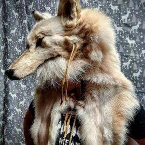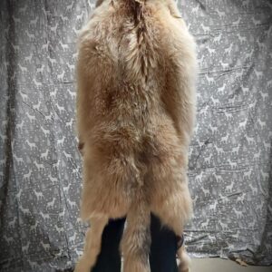 This White Arctic Wolf Shaman Headdress is a true masterpiece, crafted from a full 7-foot-long wolf hide. When worn by someone around 5 feet 6 inches tall, the magnificent tail will likely touch the ground, adding to its striking presence. The headdress features reflective eyes, giving it a lifelike and mystical aura.