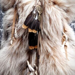 At the back, spruce hen feathers, wolf bone, and buffalo teeth accents are elegantly hung with soft lamb leather, enhancing its spiritual and aesthetic appeal. The headdress retains all four giant paws with massive claws and a thick, awe-inspiring tail, making it an extraordinary piece for those who honor the wild.
