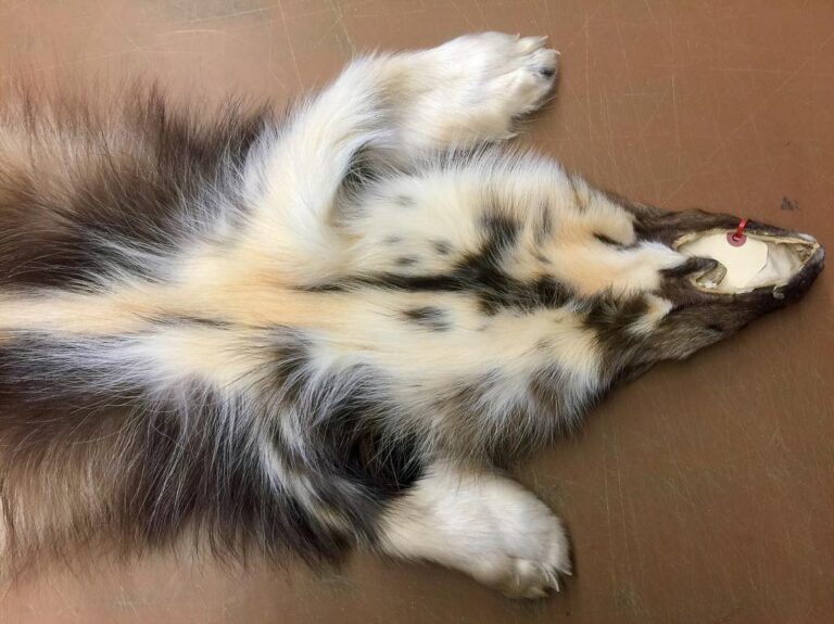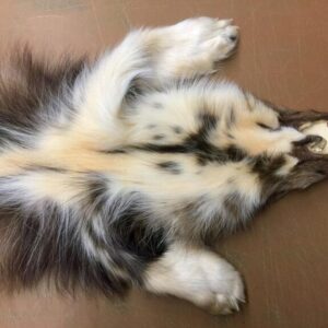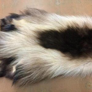 This wolverine fur pelt has white color on all its feet and also on its back and belly. HAS FEET & CLAWS, ears turned, lips split, etc. Inner lip on lower jaw mostly not turned; upper inner lip to each side of nose partly not turned. SUITABLE FOR RUG OR LIFE-SIZE. Gorgeous select quality fur. Top wolverine at recent Canadian auction. Exceptionally nice